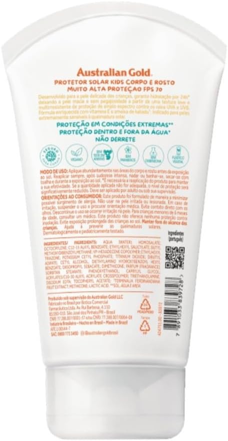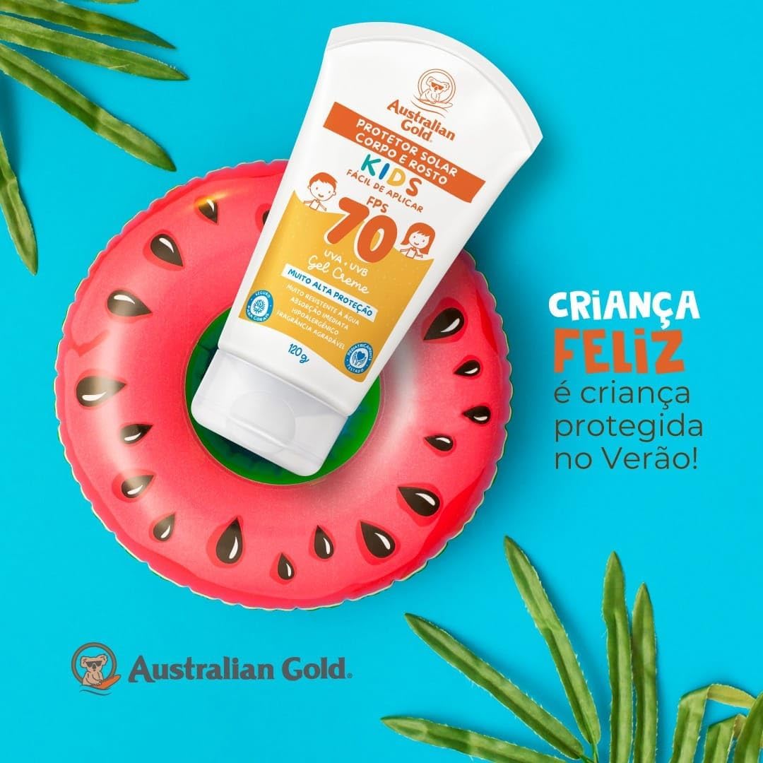 PROTETOR SOLAR CORPO E ROSTO KIDS, FÁCIL DE APLICAR, FPS70,UVA + UVB, MUITO ALTA PROTEÇÃO, MUITO RESISTENTE À ÁGUA,ABSORÇÃO IMEDIATA, HIPOALERGÊNICO, FRAGRÂNCIA AGRADÁVEL,PEDIATRICAMENTE TESTADO,SEGURO PARA CORAIS. Desenvolvido para a pele delicada das crianças, garante hidratação por 24h* deixando a pele macia e sem pegajosidade a partir de uma textura leve e multirresistente de proteção de amplo espectro contra os raios UVA e UVB. Fórmula enriquecida com vitamina E e ameixa de kakadu. Indicado para peles extremamente sensíveis à queimadura solar. PROTEÇÃO EM CONDIÇÕES EXTREMAS**, PROTEÇÃO DENTRO E FORA DA ÁGUA*, NÃO DERRETE **Sol, água e areia VEGANO / SEM TESTE EM ANIMAIS / SEM PARABENOS / SEM OXIBENZONA / PLÁSTICO VEGETAL